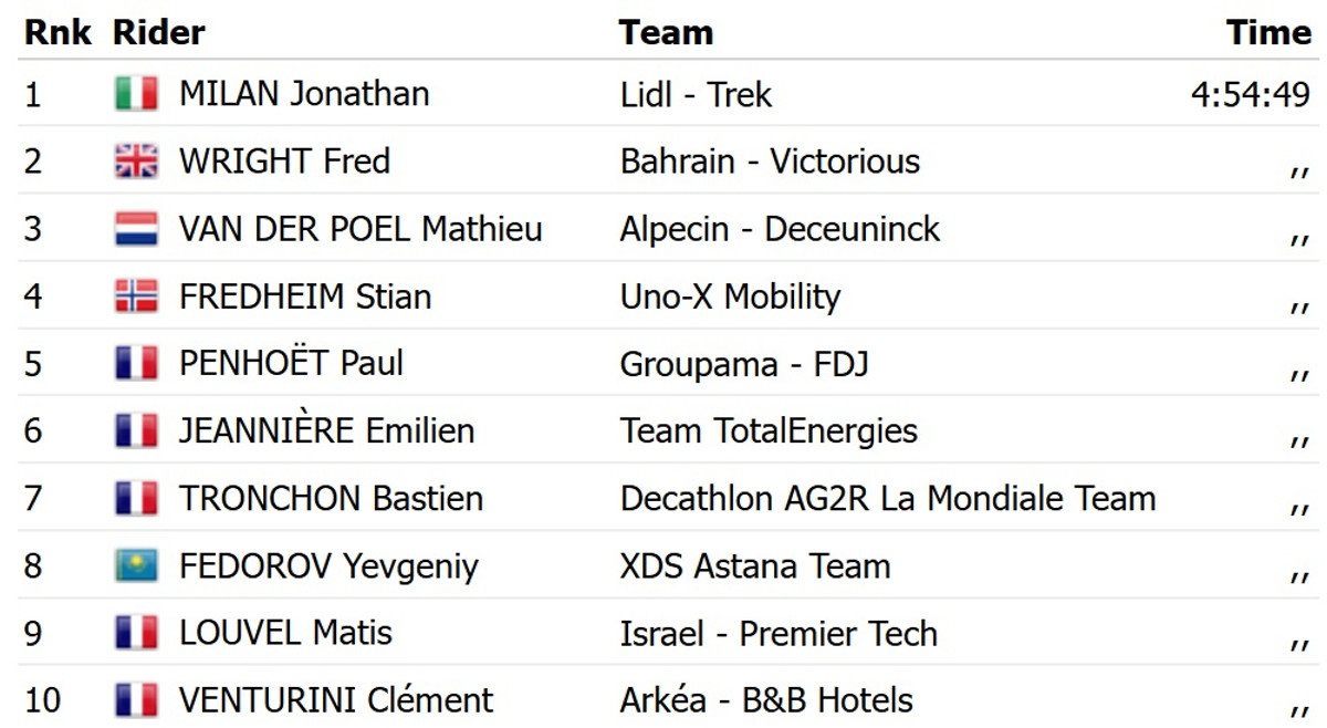 У фінішному спринті з пелотону Мілан випередив британця Фреда Райта з Bahrain Victorious і нідерландця Матьє Ван дер Пула з Alpecin Deceuninck.
