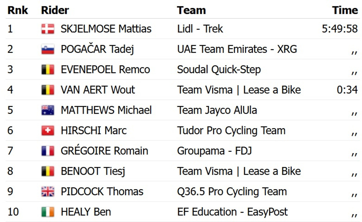 Спринт з пелотону за четверте місце виграв ще один представник Бельгії, Воут Ван Арт із Visma Lease a Bike. Минулорічний переможець, британець Том Підкок із Q36.5, фінішував дев’ятим.