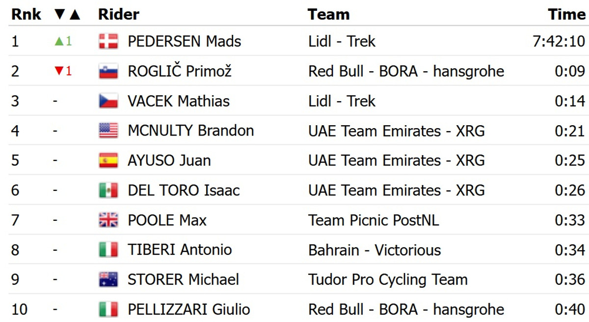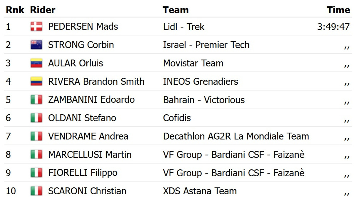 Педерсен у фінішному спринті з пелотону випередив австралійця Корбіна Стронга із Israel Premier Tech і колумбійця Орлуїса Аулара із Movistar. Для ексчемпіона світу це друга перемога на поточній Джиро. Завдяки 10 боніфікаційним секундам він повернув собі рожеву майку лідера загального заліку.
