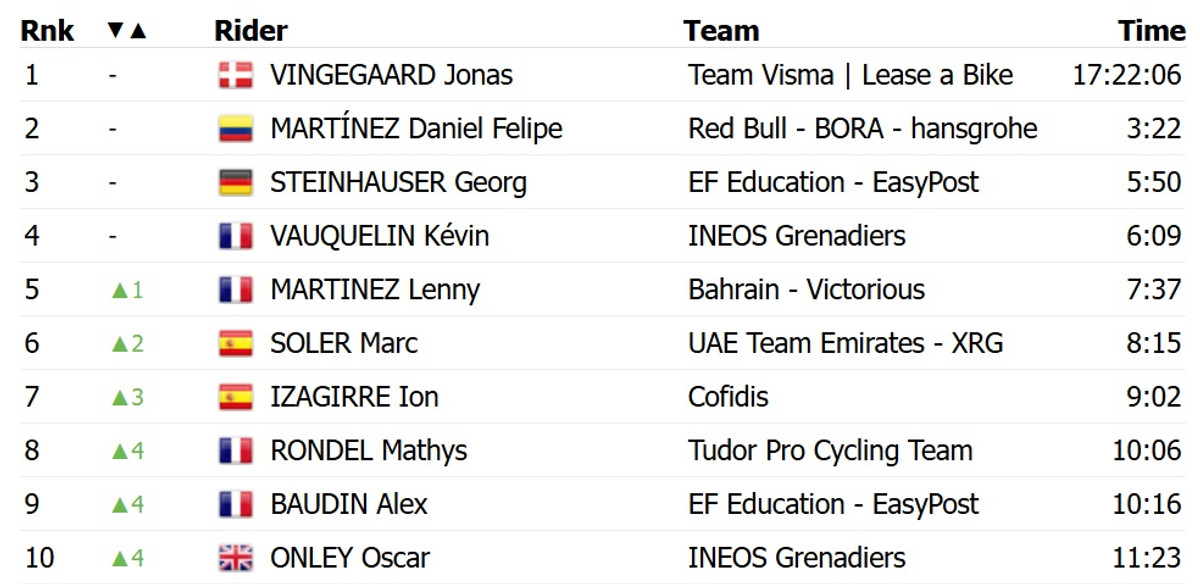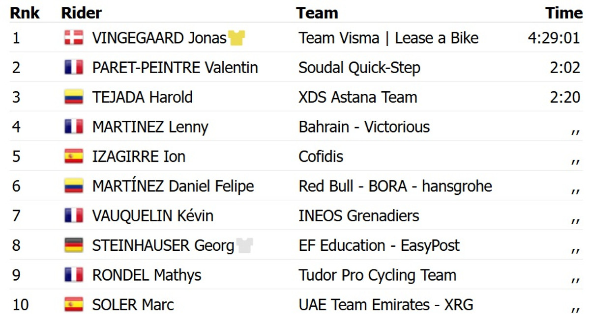 Вінгегор завдяки сольній атаці за 21 км до фінішу на 2 хвилини та 2 секунди випередив француза Валентена Паре-Пентра із Soudal Quick Step. Третім із відставанням у 2 хвилини та 20 секунд став колумбієць Харольд Техада з XDS Astana, який виграв спринт із групи переслідувачів.