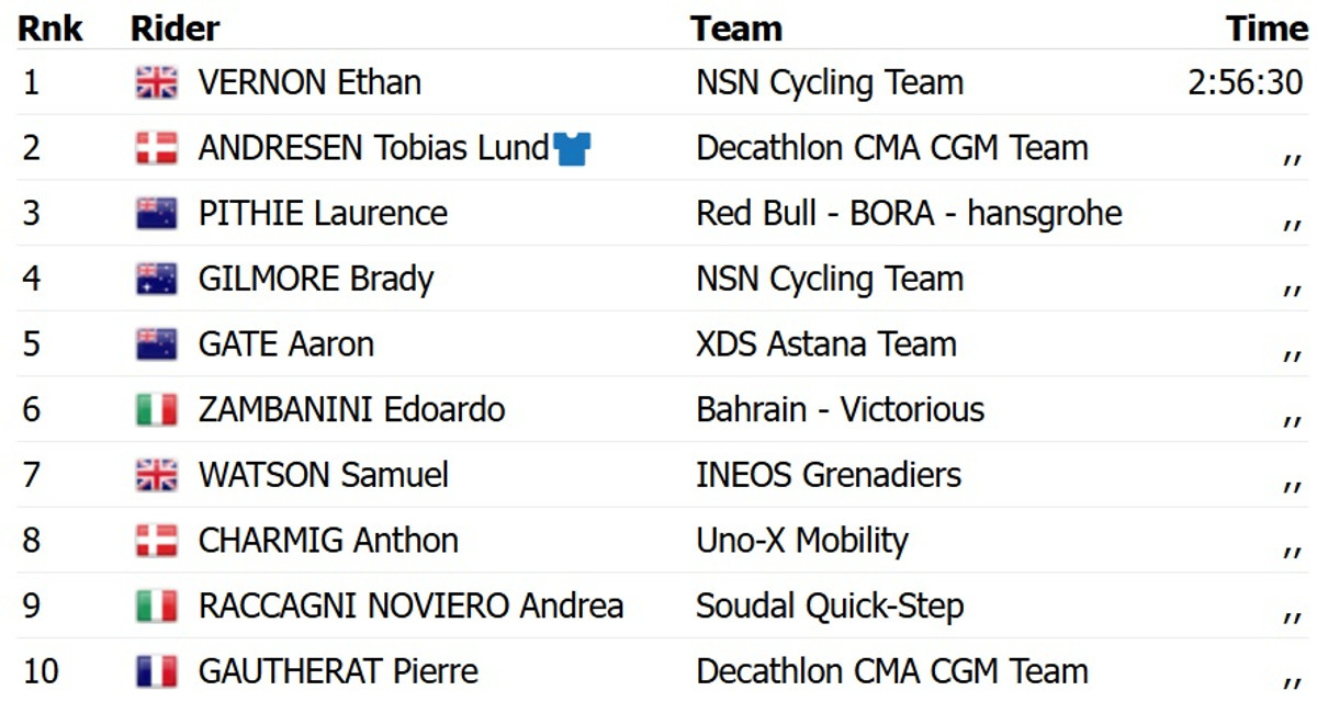 Етап виявився спринтерським із фінішем у невеличкий пагорб. Вернон у фінішному спринті випередив данця Табіаса Лунда Андресена з Decathlon CMA CGM і новозеландця Лоуренса Піті з Red Bull Bora.