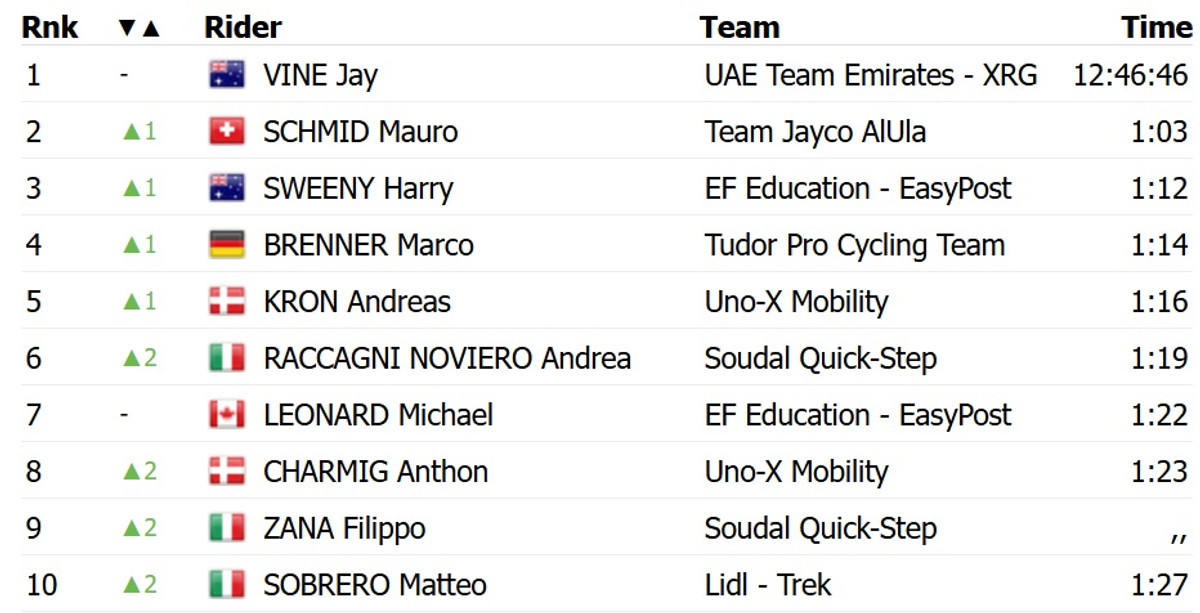 Важливі зміни відбулися в загальному заліку. Зійшов із дистанції еквадорець Джонатан Наравес із UAE Emirates, який ішов другим. Він важко впав на початку етапу та отримав переломи грудних хребців.