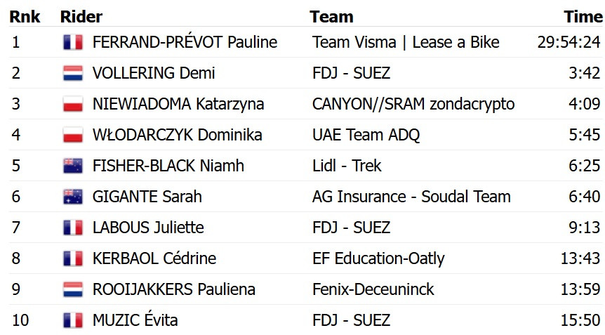 Вона виграла два заключних етапи багатоденки – восьмий і дев’ятий. У загальному заліку вона на 3 хвилини та 42 секунди випередила переможницю Туру-2023, нідерландку Демі Воллерінг із команди FDJ Suez. Топ-3 замкнула минулорічна чемпіонка, полячка Катаржина Нєвядома з Canyon Sram.