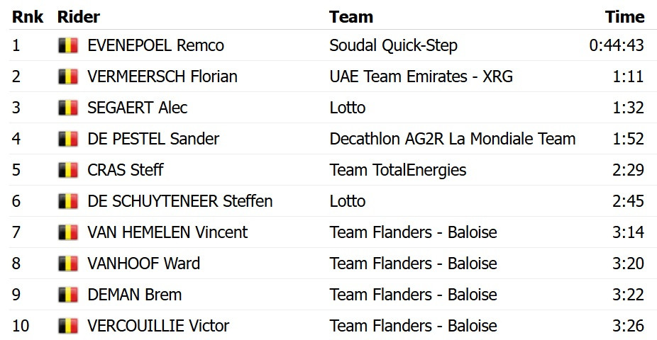 На дистанції в 40,5 ка Евенепул на 1 хвилину і 11 секунд випередив Флоріана Вермеєрша з UAE Emirates. Бронзу завоював Алек Сегарт із Lotto.