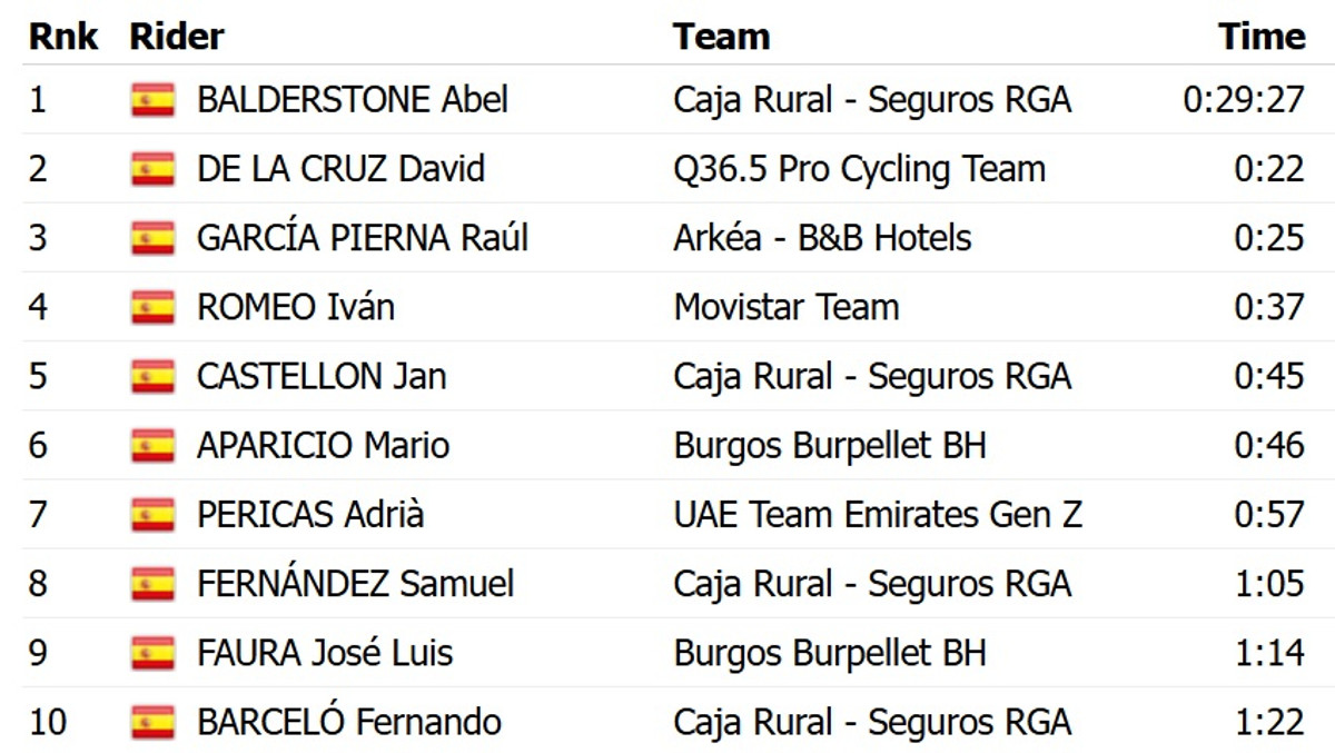 На чемпіонаті Іспанії траса цього року була гірською: підйом довжиною в 13,8 км з середнім градієнтом у 5,2%. Такий специфічний маршрут подарував сенсаційні результати: переміг Абель Болдерстоун із Caja Rural. Він на 20 і на 25 секунд відповідно випередив Давіда Де Ла Круса з Q36.5 і Рауля Гарсію П’єрну з Arkea.
