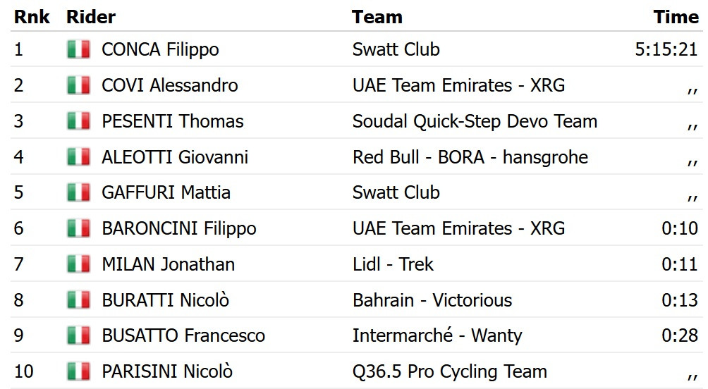 Гучною сенсацією завершився чемпіонат Італії. Перемогу святкував Філіппо Конка з любьительської команди Swatt Club. У фінішному спринті він випередив Алессандро Кові з UAE Emirates і Томаса Презенті з Soudal Quick Step Devo Team. Ще один гонщик Swatt Club, Маттіа Гаффурі, замкнув топ-5.
