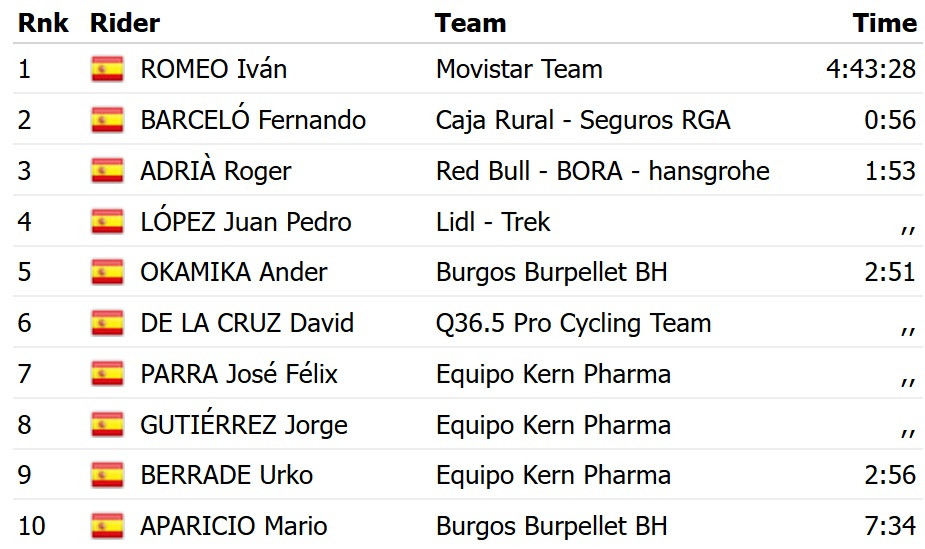В Іспанії перемогу здобув Іван Ромео із Movistar. Він на 56 секунд випередив Фернандо Берсело з Caja Rural. Бронзу з відставанням у 1 хвилину та 53 секунди завоював Роджер Адрія з Red Bull Bora.