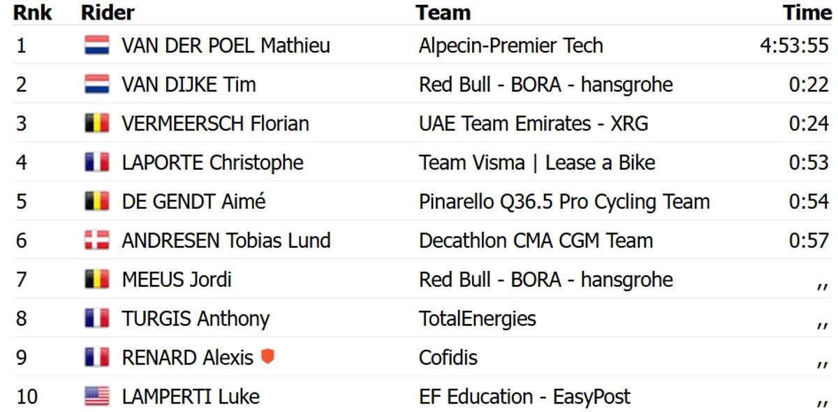Результативною виявилася атака Ван дер Пула на легендарному пагорбі Муур ван Герардсберген за 16 км до фінішу. В підсумку ексчемпіон світу на 22 секунди випередив іншого нідерландця, Тіма Ван Дейке з Red Bull Bora. Топ-3 із відставанням у 24 секунди замкнув бельгієць Флоріан Вермеєрш із команди UAE Emirates.