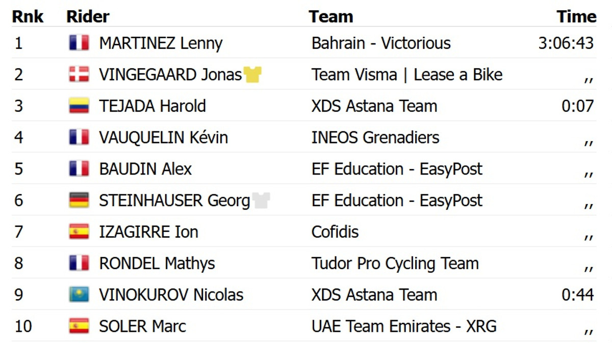 Переможцем заключного етапу став француз Ленні Мартінес із Bahrain Victorious, який у парному фінішному спринті випередив саме Вінгегора. Топ-3 на етапі замкнув Харольд Техада з XDS Astana, який виявився найшвидшим із групи переслідувачів.