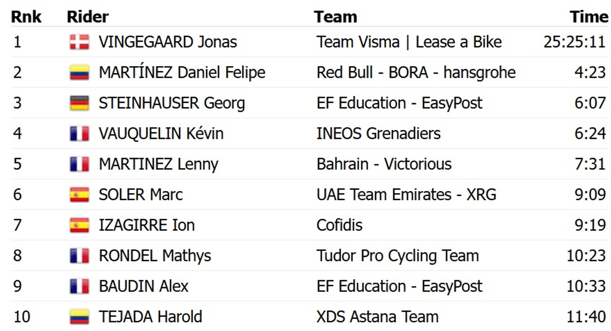 Компанію Вінгегору на підсумковому подіумі загального заліку склали колумбієць Дані Мартінес із Red Bull Bora і німець Георг Штайнхаузер із EF Education EasyPost.