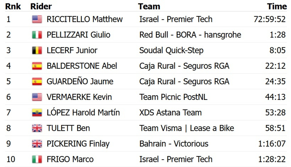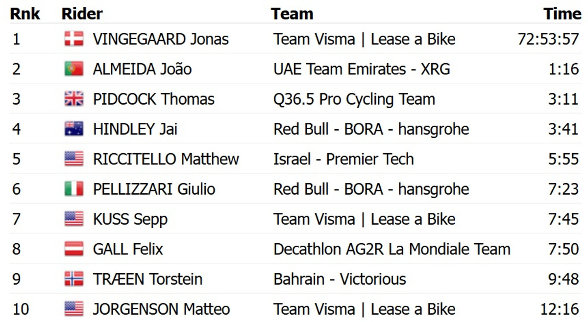 У генеральній класифікації Вінгегор на 1 хвилину і 16 секунд випередив португальця Жоау Алмейду з команди UAE Emirates. Топ-3 замкнув британець Том Підкок із Q36.5. Для Вінгегора це третій виграний Гран тур у кар’єрі – раніше він двічі (у 2022 і 2023 роках) вигравав Тур де Франс. Для Підкока це перше потрапляння на подіум Гран туру в кар’єрі.