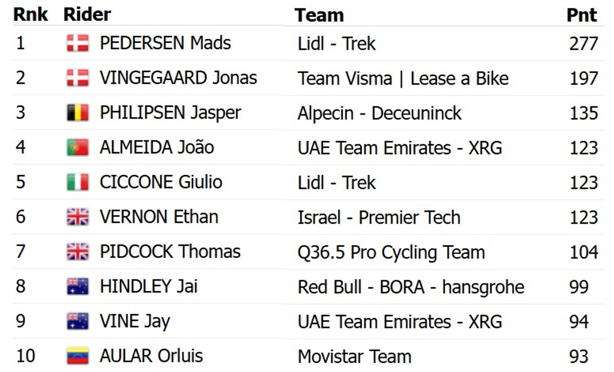 Зелену майку найкращого в спринтерському заліку завоював інший данець – Мадс Педерсен із Lidl Trek. Він набрав 277 очок, випередивши Вінгегора та бельгійця Яспера Філіпсена з Alpecin Deceuninck.