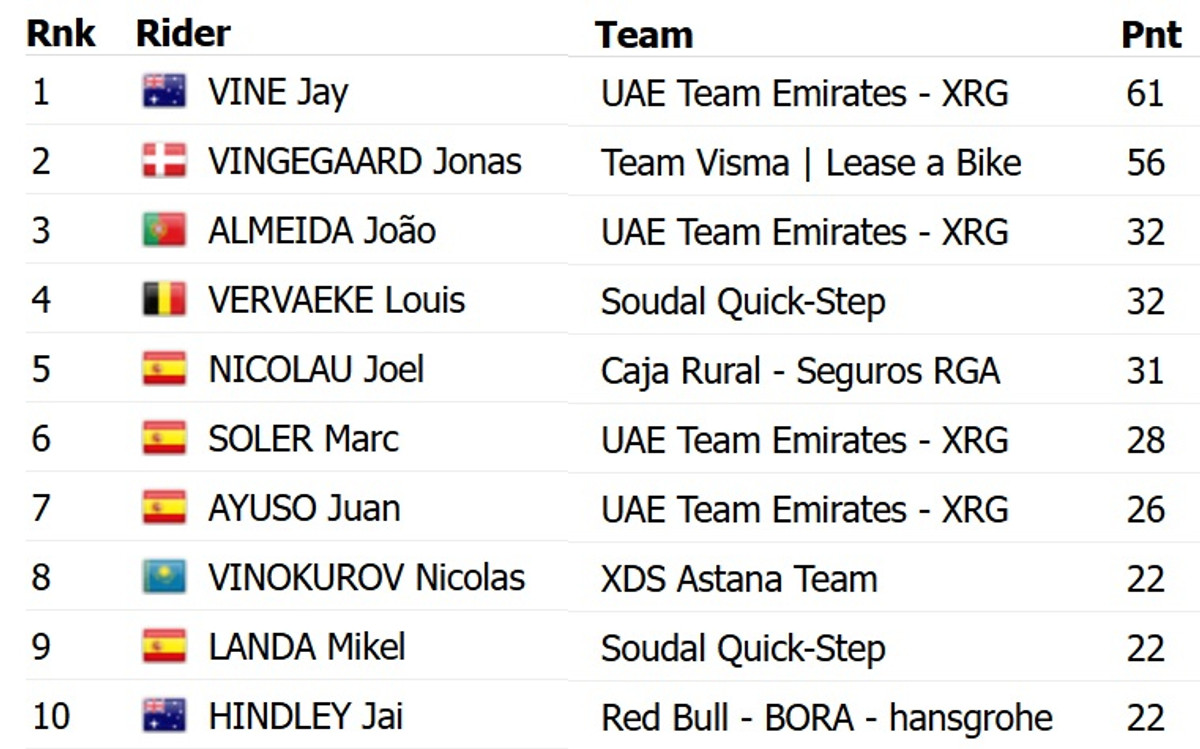 Горохову майку гірського короля завоював австралієць Джей Вайн із команди UAE Emirates. У цьому заліку Вінгегор також став другим.