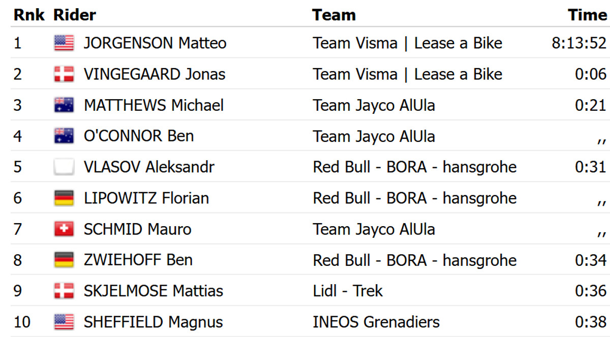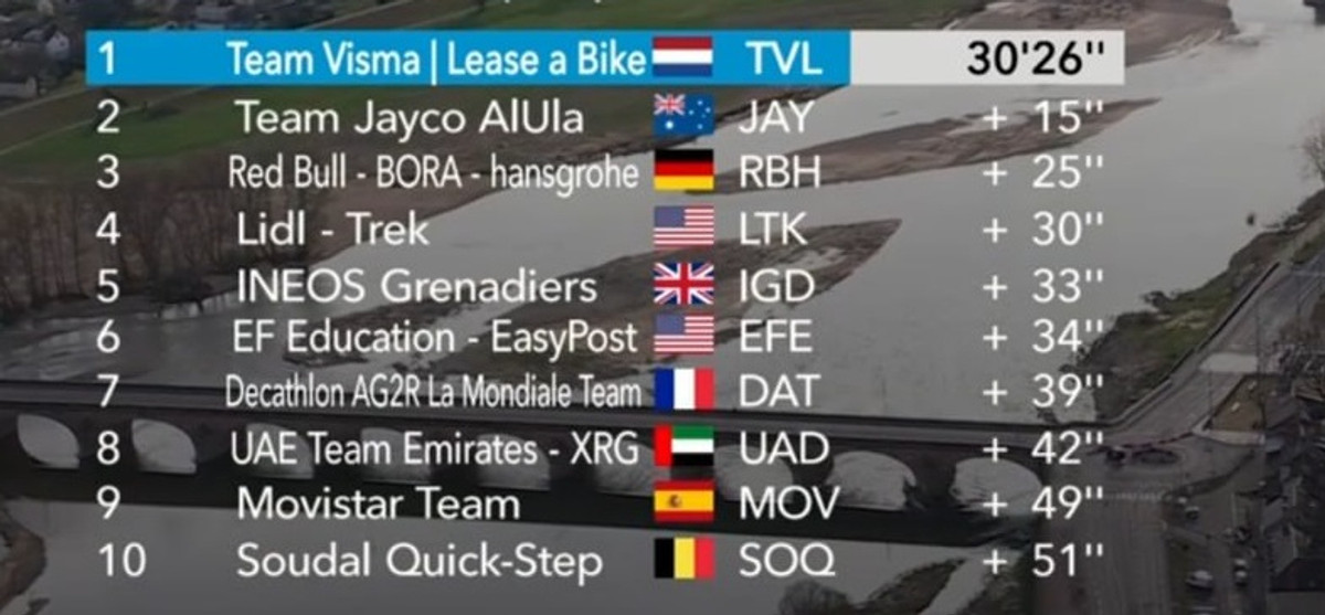 Visma Lease a Bike у складі Йонаса Вінгегора, Віктора Кампенартса, Маттео Йоргенсона, Акселя Зінгля, Пера Странда Хагенеса, Едардо Аффіні та Барта Леммена на 14 секунд випередили австралійську Jayco AlUla. Топ-3 замкнула німецька Red Bull Bora.