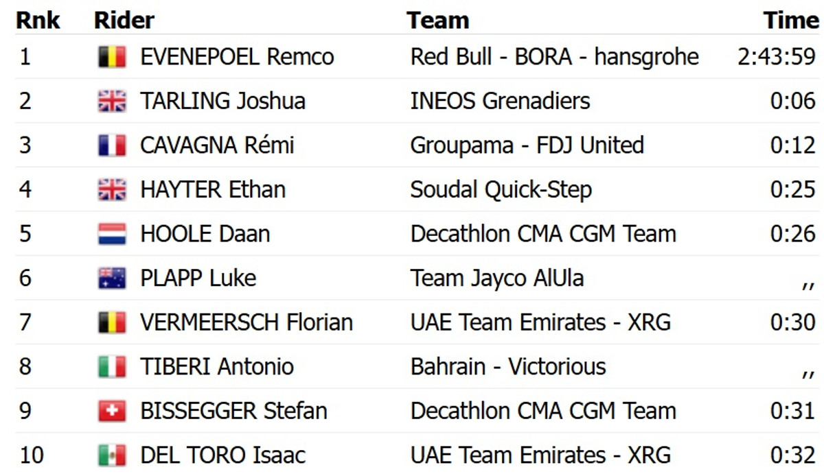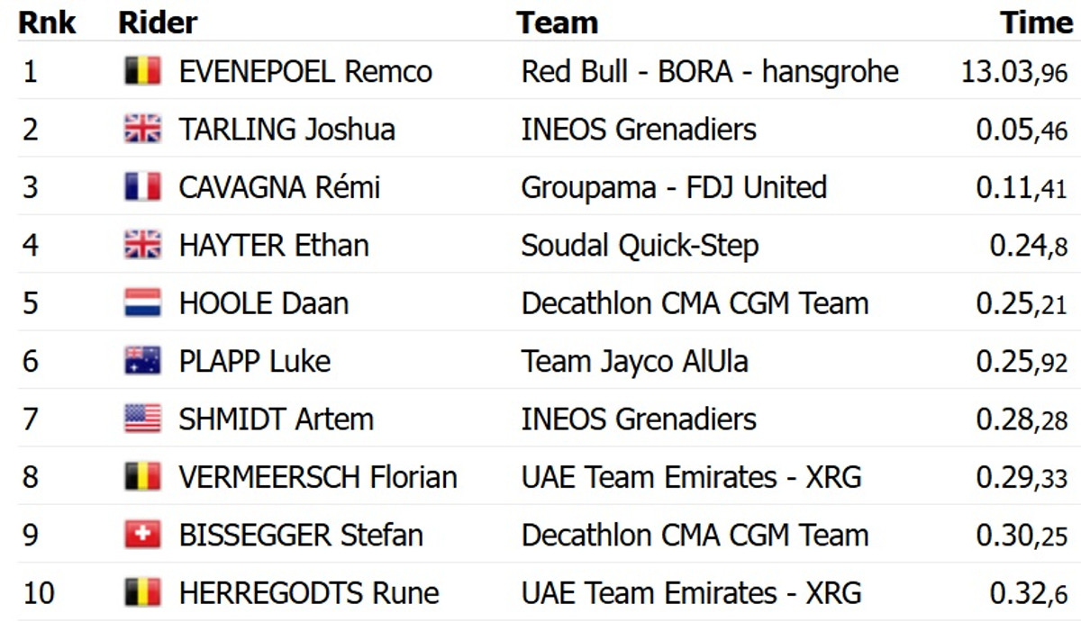 Евенепул на 5 секунд випередив британця Джошуа Тарлінга з Ineos Grenadiers. Топ-3 замкнув француз Ремі Каванья з Groupama FDJ.