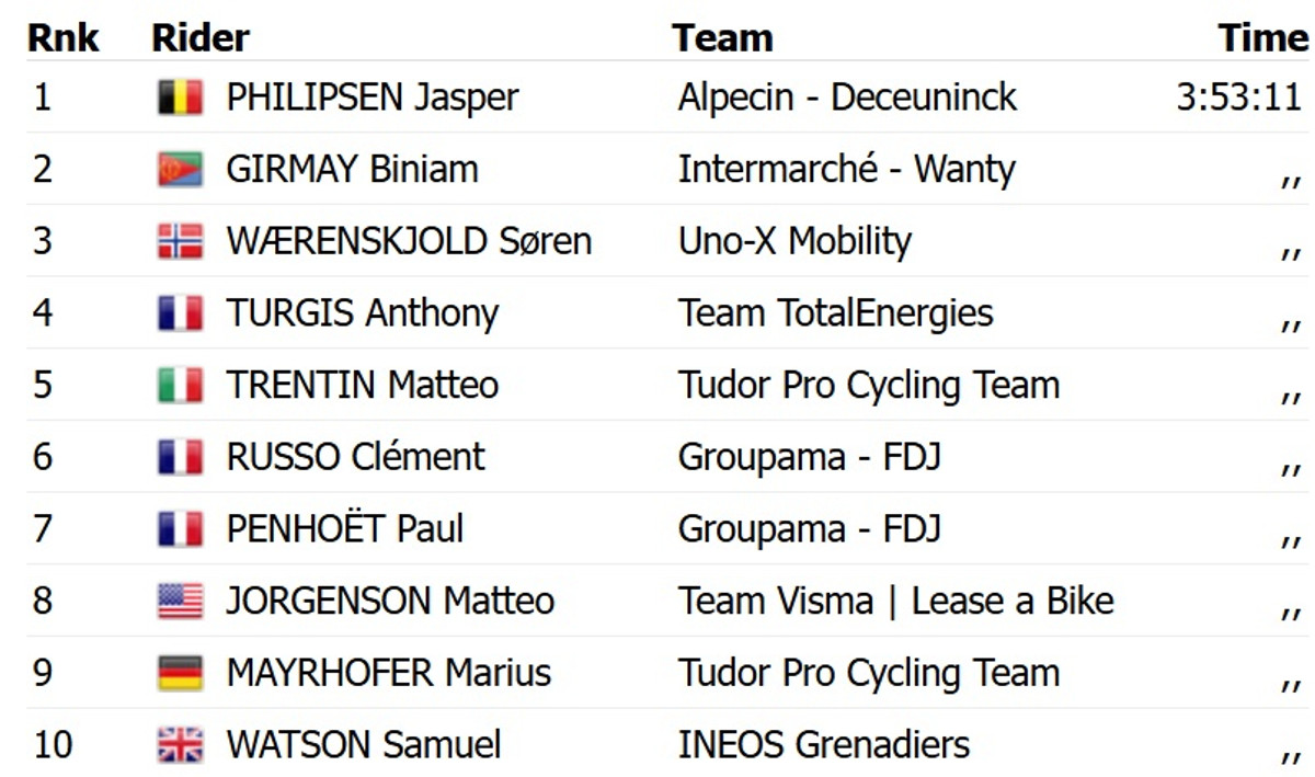 Філіпсен у фінішному спринті випередив еритрейця Біньяма Гірмая з Intermarche Wanty та норвежця Сорена Вереншольда із UnoX. Для Філіпсена це ювілейна, 10-та перемога на етапах Тур де Франс за кар’єру.
